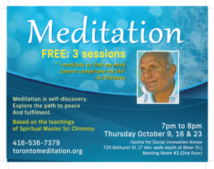 Our next FREE Meditation Sessions in Toronto are on Thursday October 9,16 and 23, 2025 from 7pm-8pm at 720 Bathurst Street (a 7 minute walk south of Bloor). See details in poster below. If you are interested please complete the contact form below with your name, email and phone number to sign up for these FREE sessions. Please add ‘Meditation Session’ in the comments section. You may also call: 416-536-7379.
